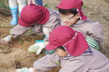「見つけた!」「見て!このさつまいも!かわいい!」という声が畑いっぱいに響き、子どもたちは協力しながらなかなか抜けないさつまいもを掘り起こし、自分たちの“さつまいもの宝物”を誇らしげに見せ合っていました。